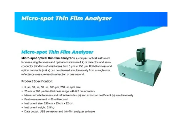 Micro-spot optical thin film analyzer is a compact optical instrument for measuring the thickness and optical constants (n & k) of dielectric and semiconductor thin-films of small areas from 5 microns to 300 microns. Measured thickness range is from 20 nm to 100 µm. Each measurement takes less than 50 milliseconds.