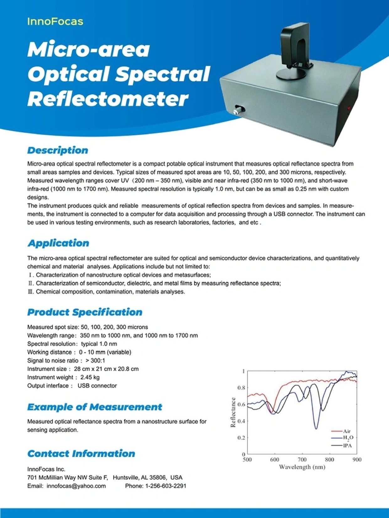 The instrument is valuable for producing quick measurement of optical reflectance spectra from small optical device surface areas. In measurement, the instrument is connected to a computer via a USB connector for data acquisition and processing. The instrument can be used in various application settings, such as research laboratories, factories, outdoor fields, and etc.
